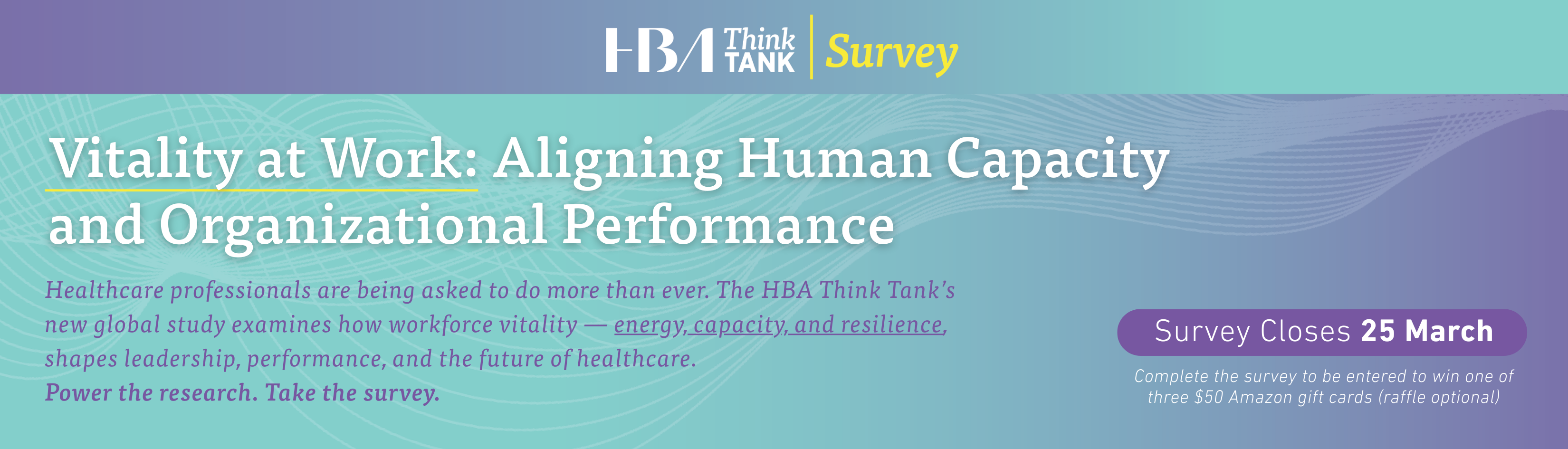 As a thank you for your time and insights, everyone who completes the survey will be entered into a raffle to win one of three $50 Amazon gift cards. Participation in the raffle is optional and not required to complete the survey. If you would like to enter the raffle without completing the survey, please contact thinktank@hbanet.org.